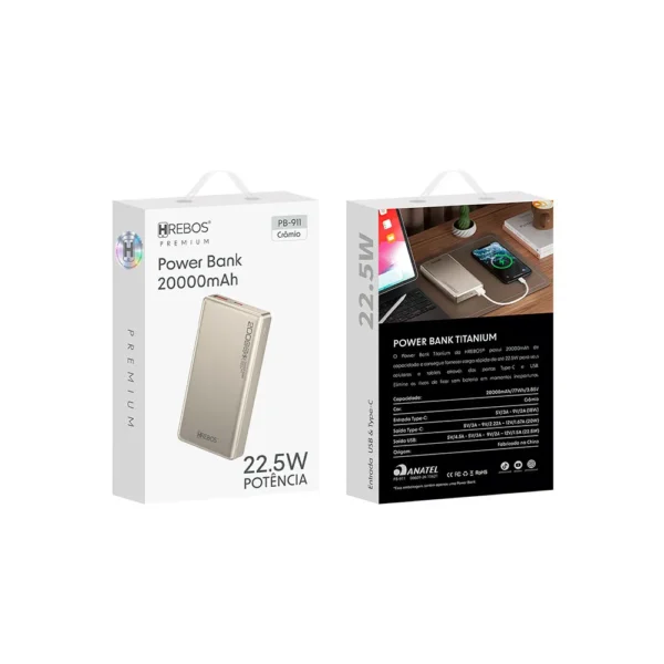 Energia de sobra para o seu dia a dia. O Power Bank PB-911 da Hrebos conta com capacidade de 20.000mAh, ideal para recarregar seus dispositivos várias vezes sem se preocupar com tomadas.