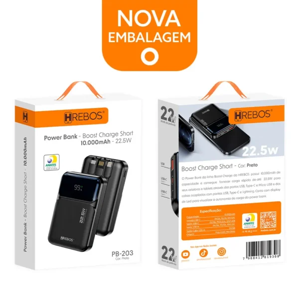 O Power Bank Hrebos PB-203 é a escolha ideal para quem busca potência, praticidade e compatibilidade total. Com 10.000mAh de capacidade, ele garante várias recargas para seus dispositivos, mantendo você conectado o dia todo.