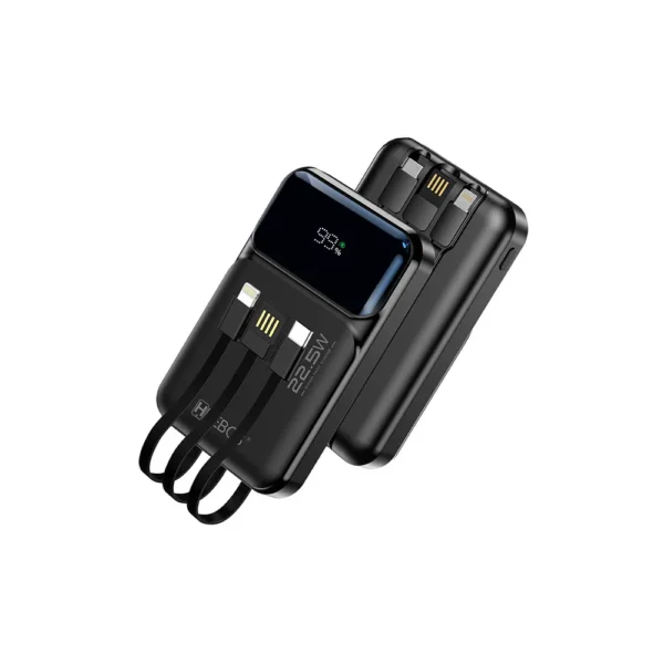 Carregador portátil com alta capacidade, carregamento rápido e cabos acoplados para Android e iOS. Compacto, seguro e pronto para te acompanhar em qualquer lugar.